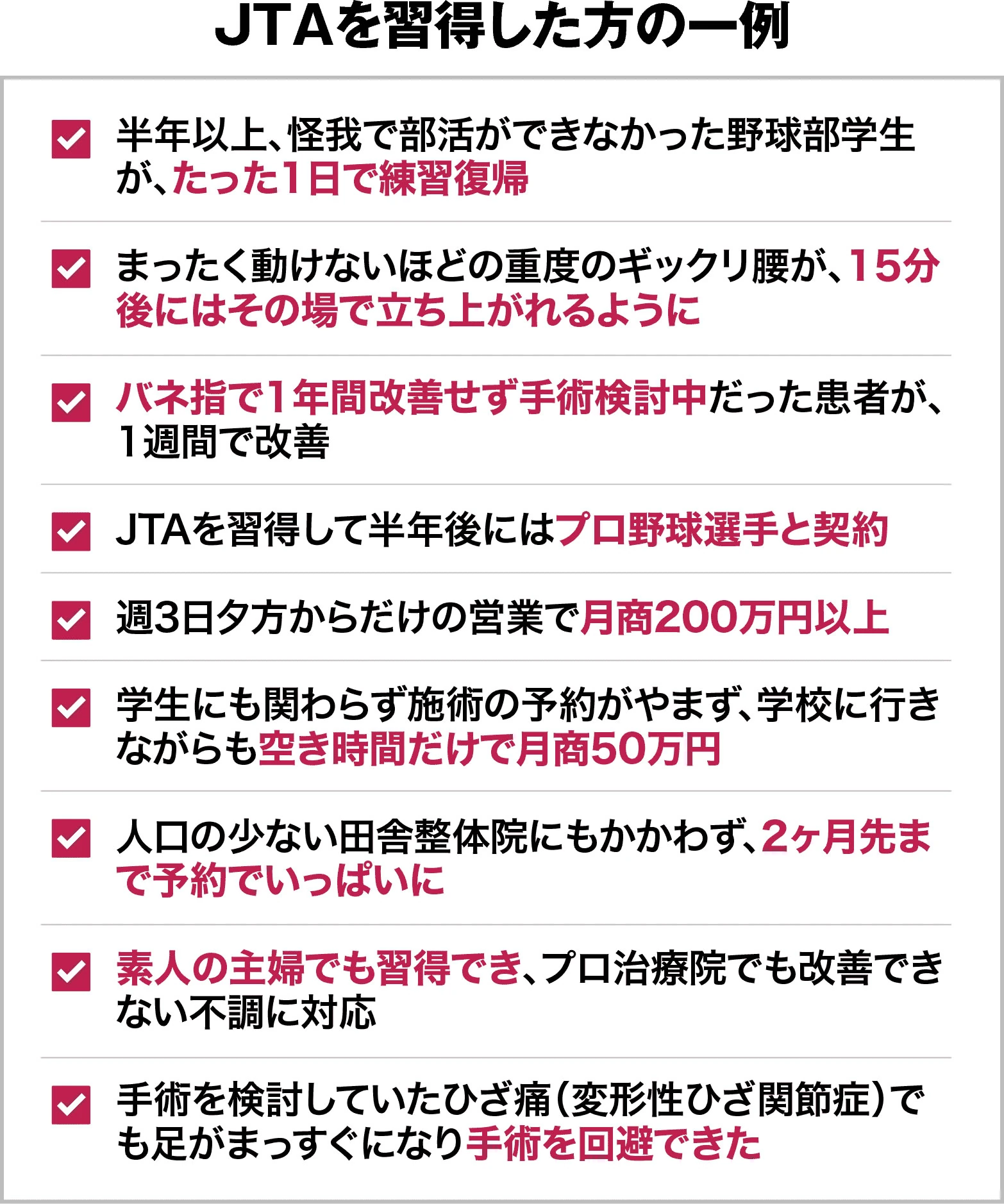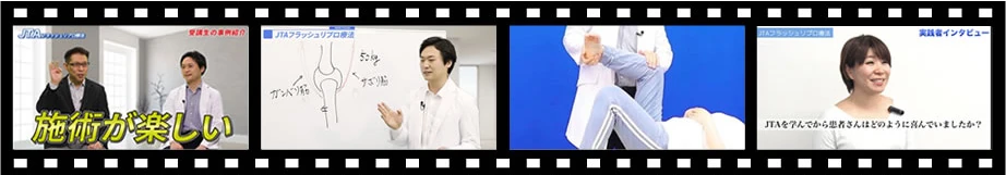 また、施術法としての「JTAフラッシュリプロ療法」を考案し、理学療法士などのリハビリ職種だけではなく、柔道整復師、鍼灸師、整体師、これから整体師になりたい人向けに誰でも関節の痛みを改善させられる技術を教えている。
